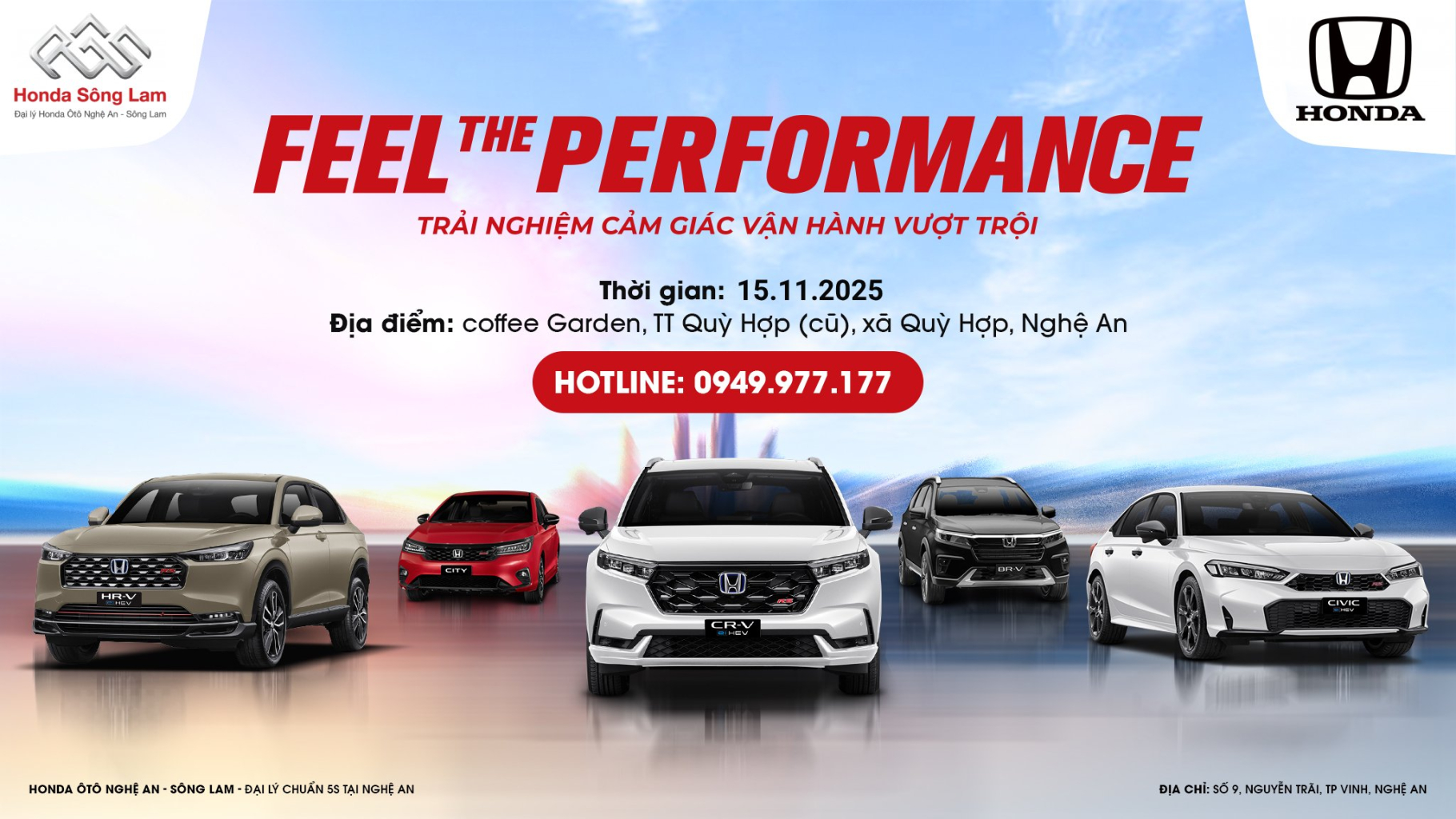 Cùng Honda Ô tô Sông Lam tham gia ngay chương trình lái thử “Feel The Performance” – nơi hiệu năng đỉnh cao của Honda mang đến trải nghiệm lái đầy hứng khởi và thăng hoa cảm xúc trên từng hành trình.